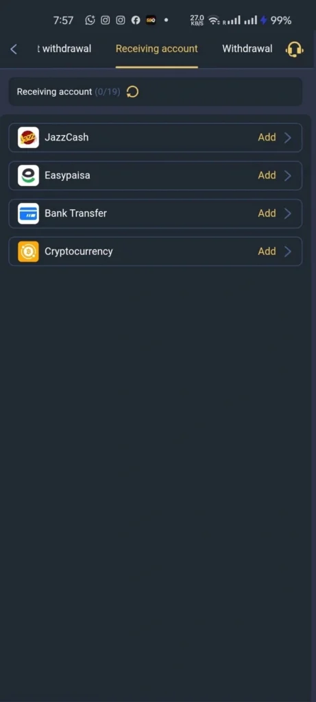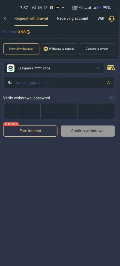 - Select “Withdraw” and choose your preferred mobile wallet(EasyPaisa/JazzCash).